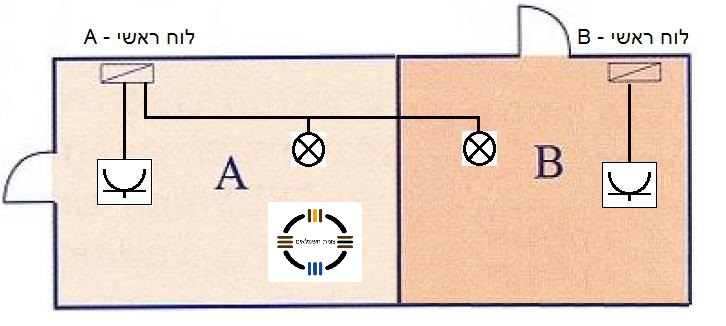 בעל חנות הממוקמת בשטח A החליט להשכיר חלק מהמבנה ללקוח חדש שימוקם בחלק B כמתואר בשרטוט. לצורך כך, הותקן חיבור חדש ולוח חדש (לוח B ) שיזין את כל השקעים בשטח B . במסגרת הסכם השכירות, הוחלט שכל מעגלי התאורה בשני האזורים יוזנו מלוח A בלבד. מהי התשובה הנכונה מבין התשובות הבאות בהתאם לתקנות החשמל במקרה זה?