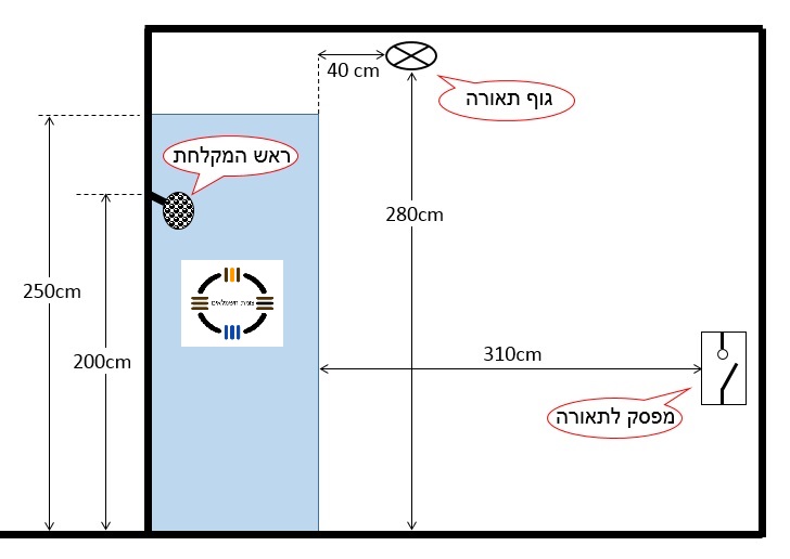 חשמלאי נדרש להתקין גוף תאורה בחדר רחצה בתוך צימר כמתואר בשרטוט.